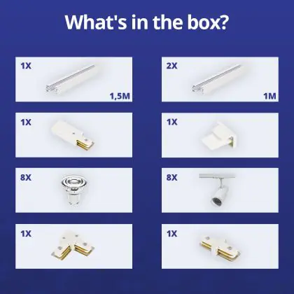 | Manufacturer Name | Complete L shaped 1-Phase Track Set White incl. 8x Spot fixture + GU10 2700K 3W Dim – 1.5 x 2 meters | |